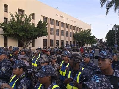 La Policía Nacional ha reforzado la noche de este domingo la seguridad en los alrededores del Palacio de Justicia de Ciudad Nueva, Distrito Nacional, donde el juez Rigoberto Sena tiene previsto dictar medidas de coerción contra los 10 imputados de la presunta estructura criminal que operó en el Seguro Nacional de Salud (Senasa) y que habrían generado un perjuicio contra el Estado por más de 15,900 millones.