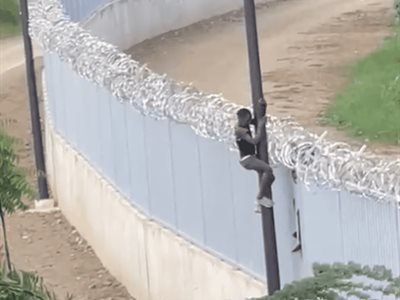 Se trata de dos jovencitos, de contextura delgada que trepan al muro de concreto que sirve de zapata, continúan en la parte enverjada y luego cruzan la alambrada sin rasguñarse (uno de ellos incluso está sin camiseta). Acto seguido se suben al poste de electricidad del lado dominicano y se deslizan como si bajaran de un palo encebado.