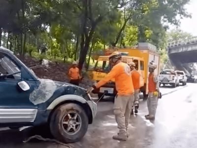 En un video publicado por la Defensa Civil en Instagram se observa a personal de la institución moviendo la yipeta en que viajaba el herido, que se viró durante el accidente.